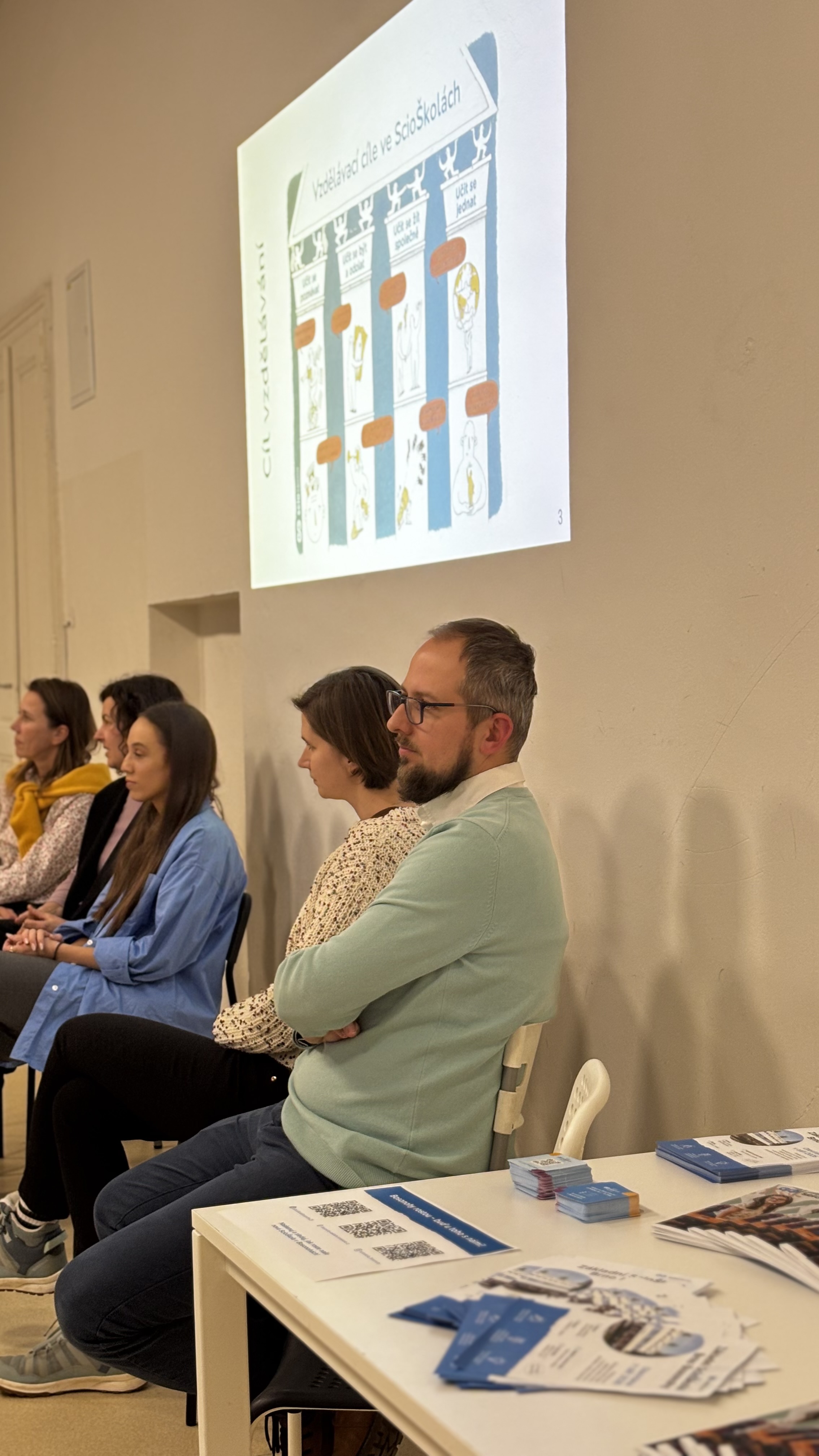Beseda byla také příležitostí k osobnímu setkání s nově vybraným vedením Základní ScioŠkoly Bosonohy. Dominika Coufalová a Jiří Starý krátce nastínili vizi, se kterou do projektu vstupují, a byli připraveni reagovat na vaše konkrétní dotazy. Katka Kašíková za Radu ScioŠkol pak doplnila kontext z pohledu dalších ScioŠkol a představila také nové vizualizace interiéru budovy. Vysvětlila, jak budou vnitřní prostory fungovat, aby co nejlépe podporovaly náš styl výuky a komunitní život.