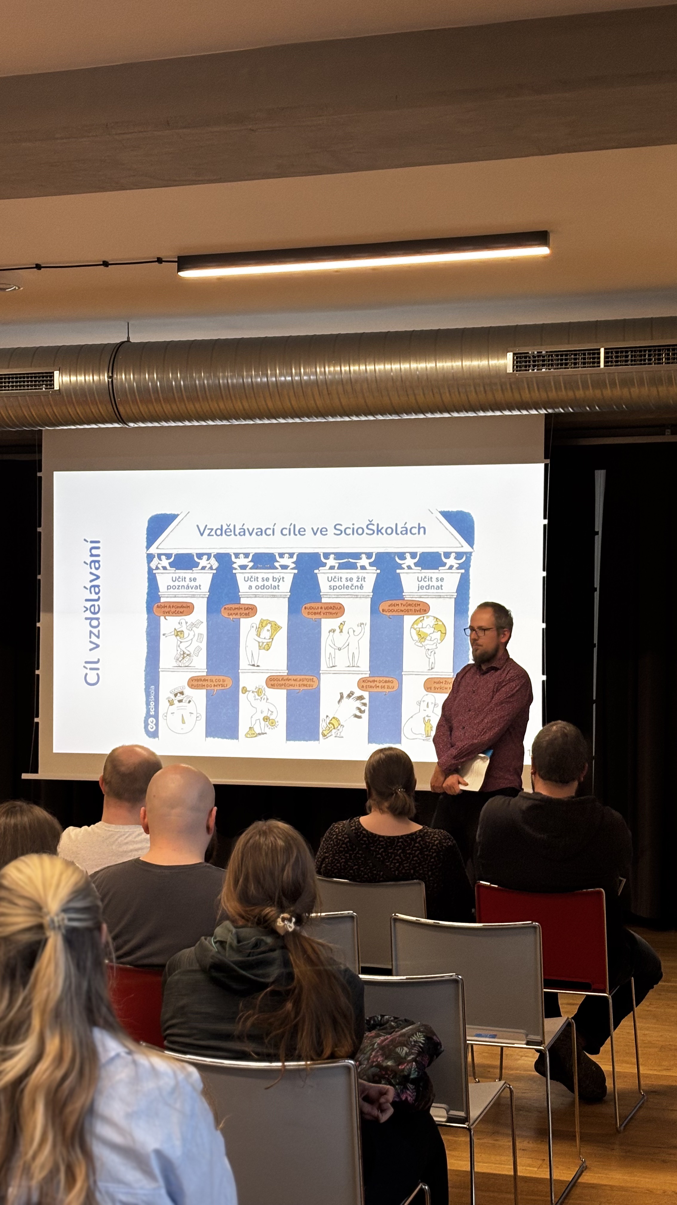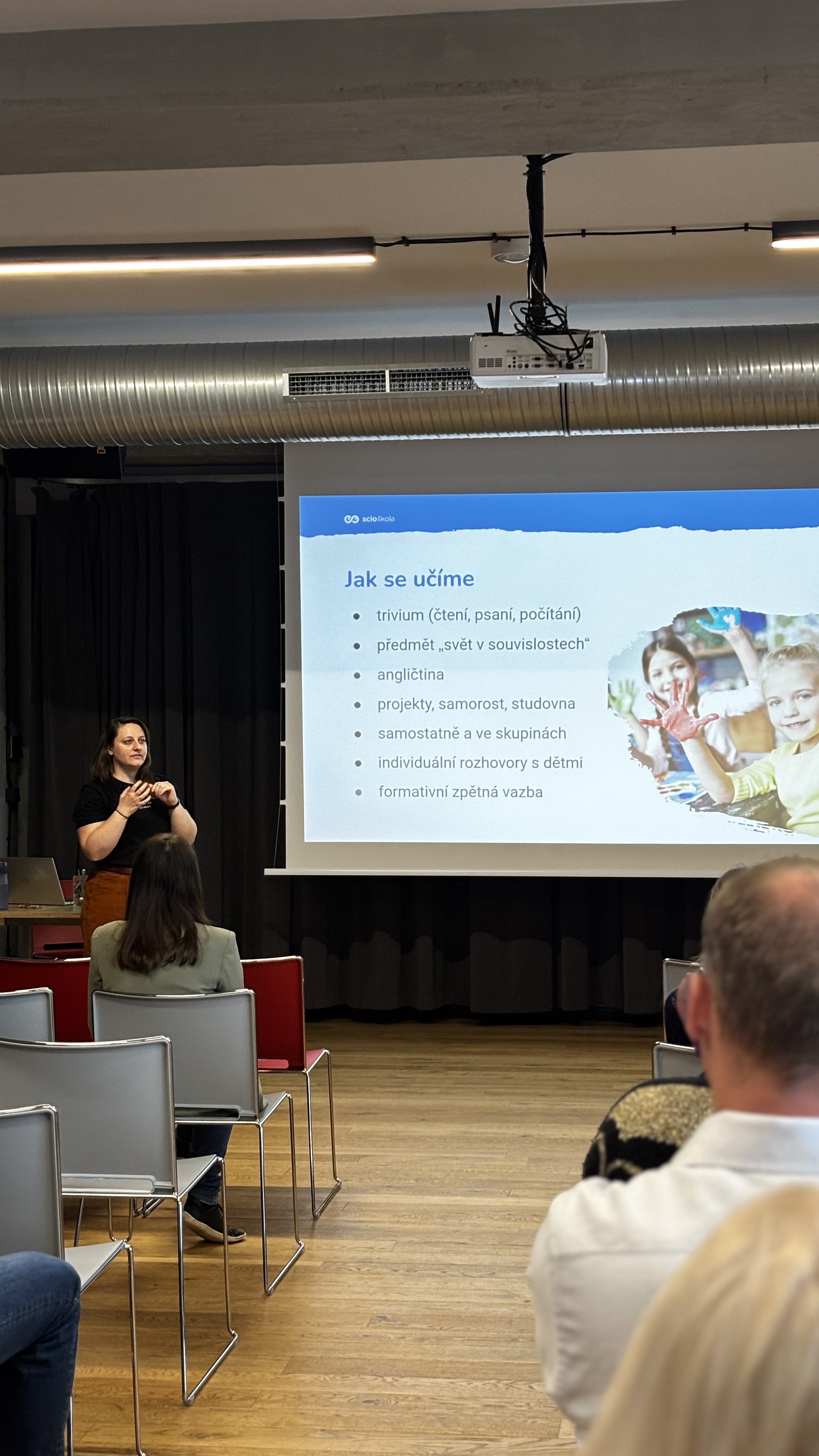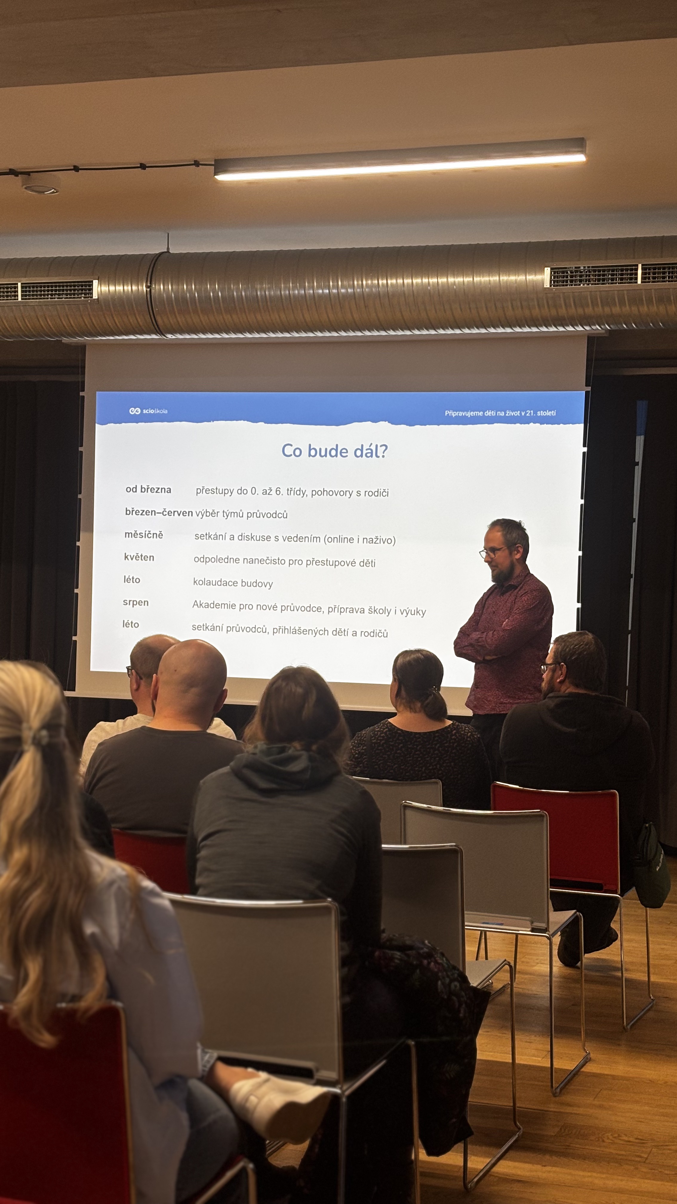 Velkým obohacením večera byla účast našeho speciálního hosta. Z naší sesterské ScioŠkoly Brno-Heršpice za námi dorazila Tereza Kašparcová. Jako zkušená průvodkyně a ambasadorka takzvaných ScioCílů sdílela s rodiči své letité zkušenosti z praxe. Z první ruky tak přítomným přiblížila, jak náš vzdělávací koncept funguje v každodenním chodu třídy a jak přesně s dětmi rozvíjíme dovednosti, které uplatní v reálném životě.