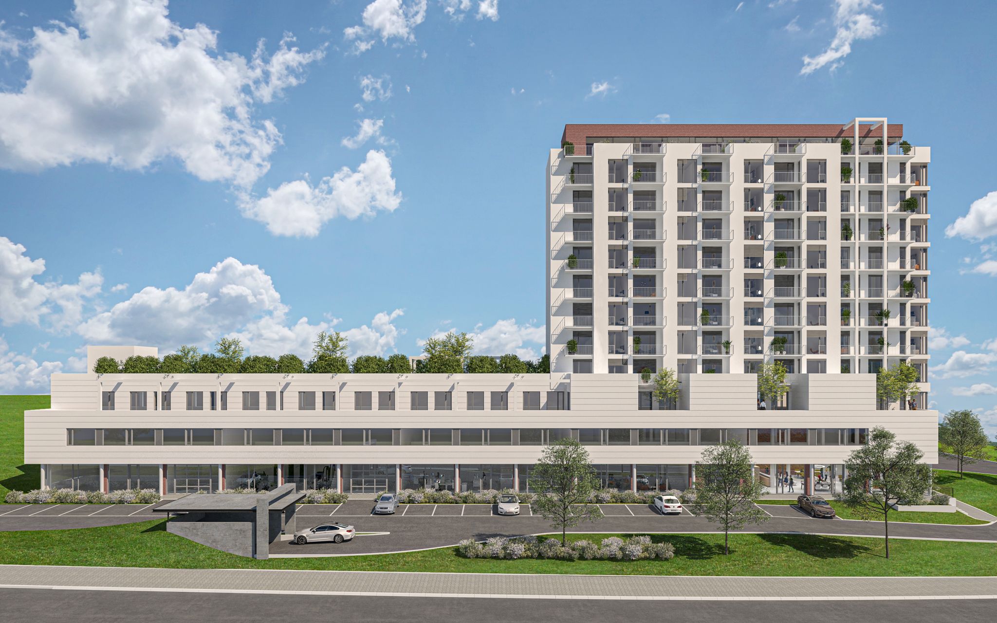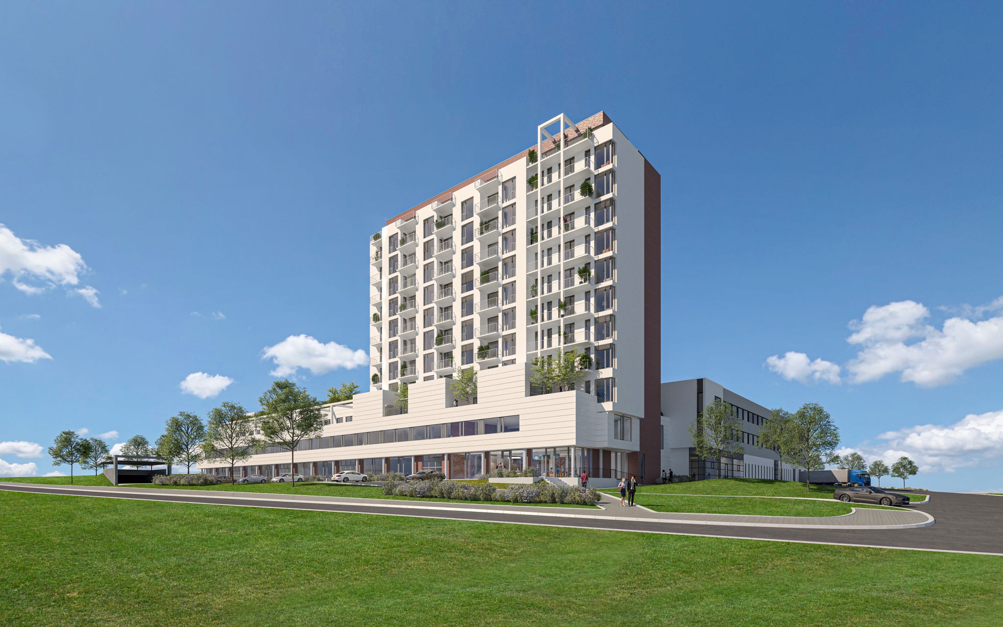 V Bosonohách vzniká nová budova, ve které od září 2026 začne fungovat základní i střední ScioŠkola. Škola bude mít k dispozici dvě spodní podlaží nižší budovy v popředí s celkovou kapacitou až 400 žáků – v přízemí bude základní škola, v 1. patře střední škola.